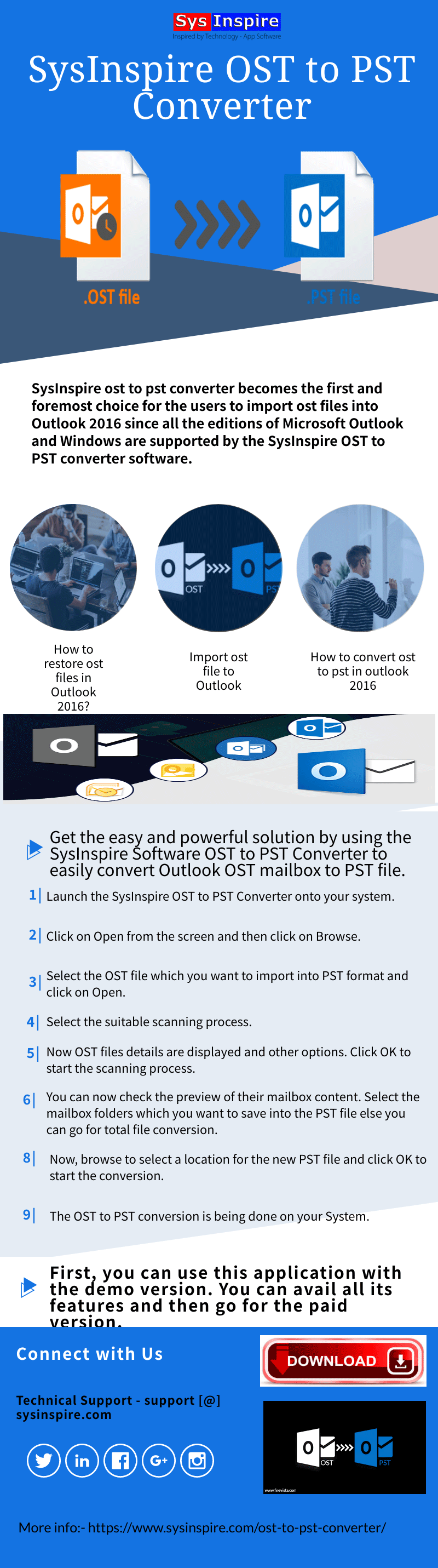 With the support of the SysInspire OST to PST Converter Tool, you can not only recover data but also convert it to the Outlook PST file format with ease. It has a number of features, including support for cloud-based applications Office365 and Live Exchange Server, as well as OS Windows versions such as Win 95, Win NT, Win 98, Win ME, Win XP, Win Vista, Win 7, Win 8, Win 8.1, Win 10 (32bit & 64bit), and the ability to preview recovered mailboxes before conversion.